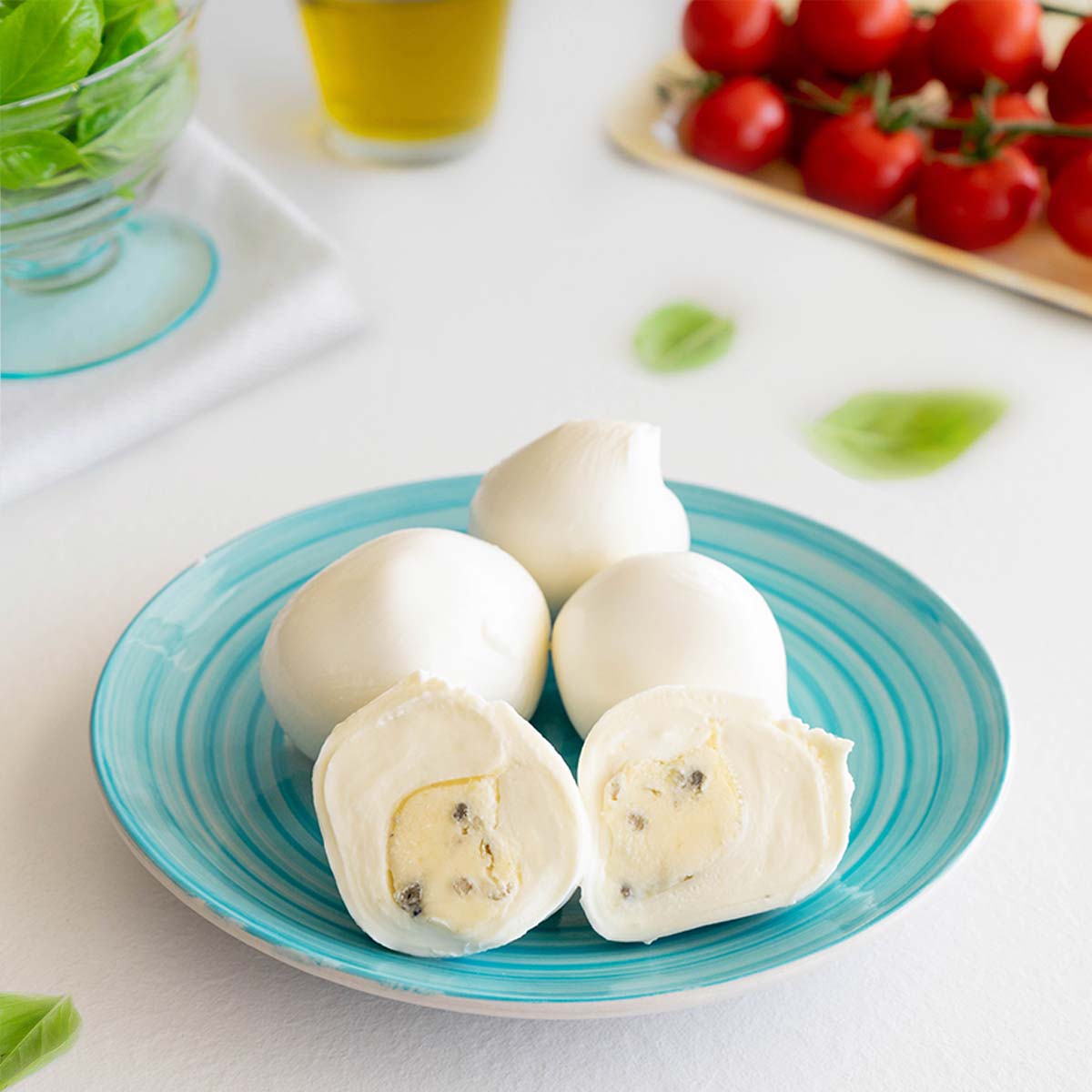 Mozzarella is a fresh cow’s milk cheese, with a soft and stringy consistency and a delicate flavour. This cheese is obtained from the processing of raw or pasteurized cow’s milk, which is coagulated by adding rennet or citric acid. The term “mozzarella” derives from the verb “mozzare”, which means to cut by hand, referring to the practice of cutting cheese by hand to form the characteristic balls. In this variant Voglia di latte offers mozzarella filled with tuna. Ideal for eating plain, in salads, pizzas or bruschetta.
