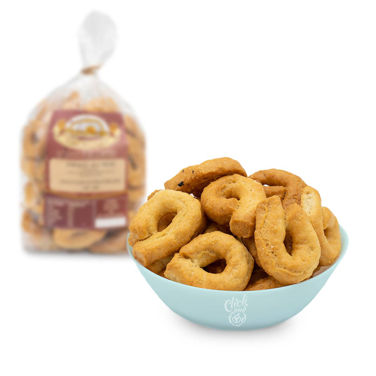 Artisanal handmade Taralli made only with flour, extra virgin olive oil, white wine and salt. Tasty and crumbly, they are the undisputed protagonists of Apulian aperitifs, ideal for aperitifs or as a tasty snack.