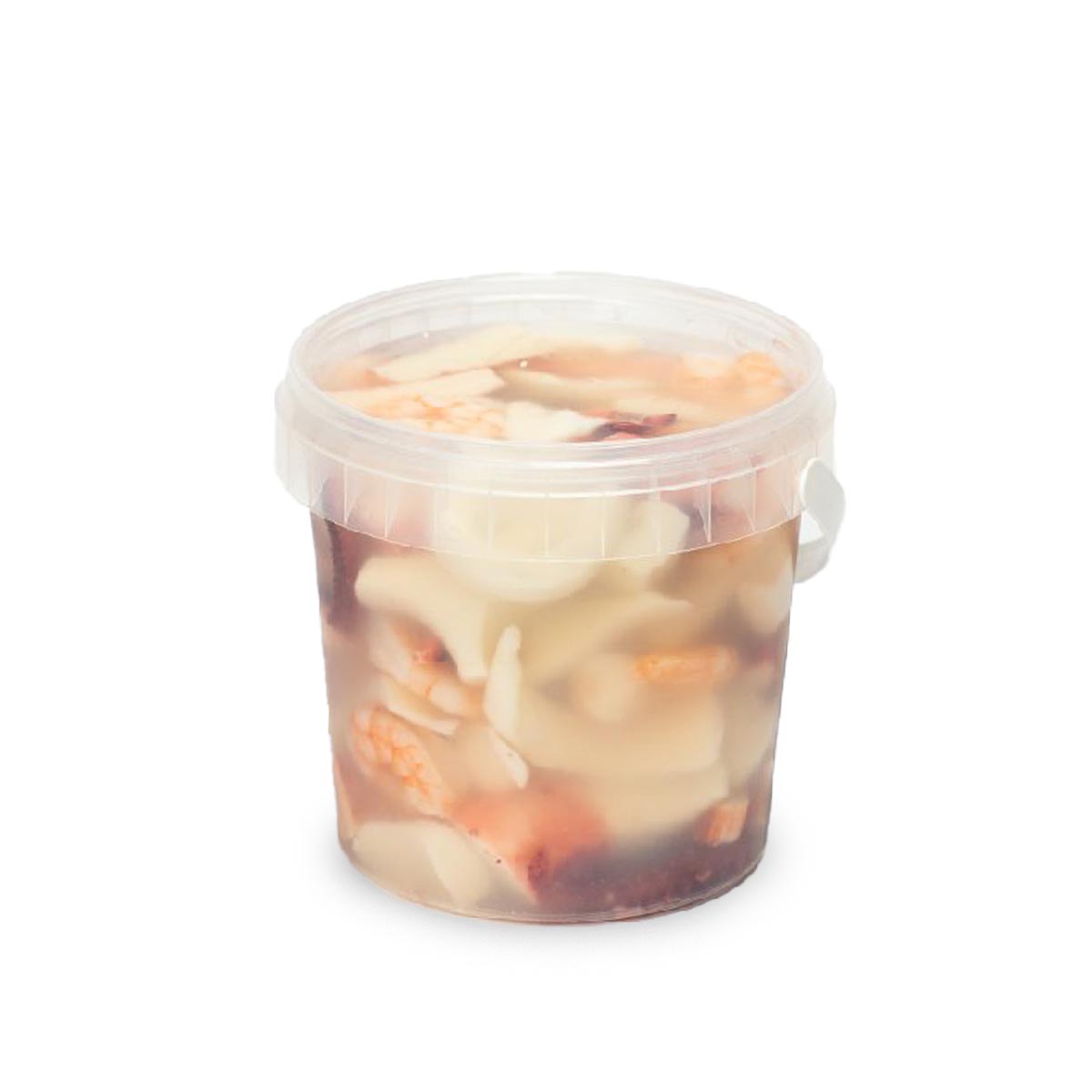 Seafood salad composed of prawns and squid. The Mare Gioioso line of marinated products is the result of a careful selection of raw materials and subsequent marinating, one of the oldest fish preservation techniques. This technique does not involve the addition of fats so it is the ideal solution for those on a diet who do not want to exaggerate with calories, but without giving up a tasty and tasty dish. The marinade takes place by expertly mixing salt, sugar, flavorings and lemon juice. A very fresh product cut manually and chilled before processing allows us to offer the highest quality.