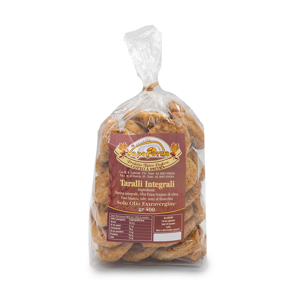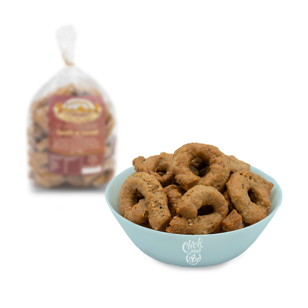 Handmade Taralli made only with wholemeal flour, extra virgin olive oil, white wine, salt and fennel seeds. Tasty and crumbly, they are the undisputed protagonists of Apulian aperitifs, ideal for aperitifs or as a tasty snack.