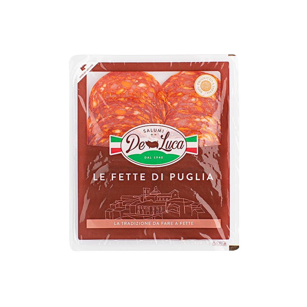Sliced Ventricina is a cured, spiced and spicy cured meat. Obtained exclusively from selected and tracked pigs. Made in the Dauni Mountains of Puglia with mountain seasoning, among woods at 1,000 meters with integrated natural ventilation. Average maturation: 2 months. Processed according to classic tasty recipes.